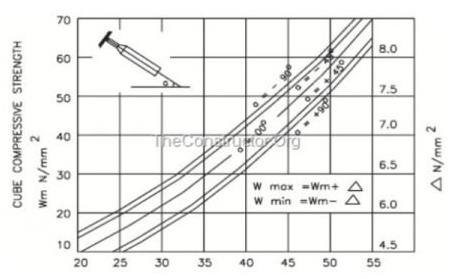 As such the estimation of strength of concrete by rebound hammer method cannot be held to be very accurate and probable accuracy of prediction of concrete strength in a structure is ± 25 percent. If the relationship between rebound index and compressive strength can be found by tests on core samples obtained from the structure or standard specimens made with the same concrete materials and mix proportion, then the accuracy of results and confidence thereon gets greatly increased.